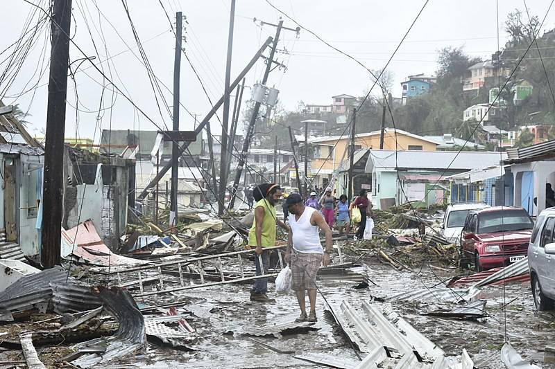 A road in the Roseau area, Dominica, is littered with debris, uprooted vegetation and felled poles and power lines from Hurricane Maria from 19 September 2017. Credit: Roosevelt Skerrit under CC0 1.0